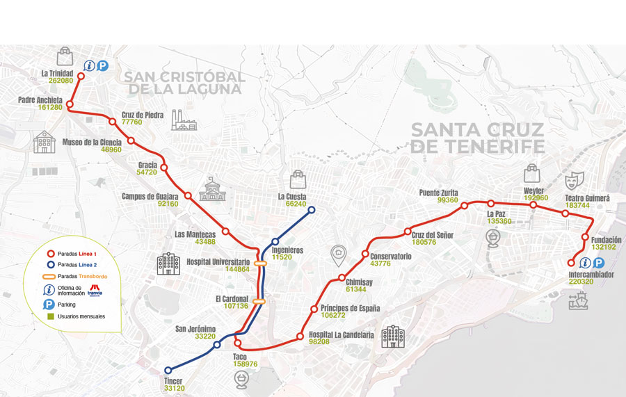 El tranvía de Tenerife conecta las dos grandes ciudades de la isla: Santa Cruz de Tenerife y La Laguna, un corredor con más de 400.000 habitantes y una intensa actividad diaria, incluida los visitantes cruceristas que anualmente alcanzarían los 3 millones en estas zonas.